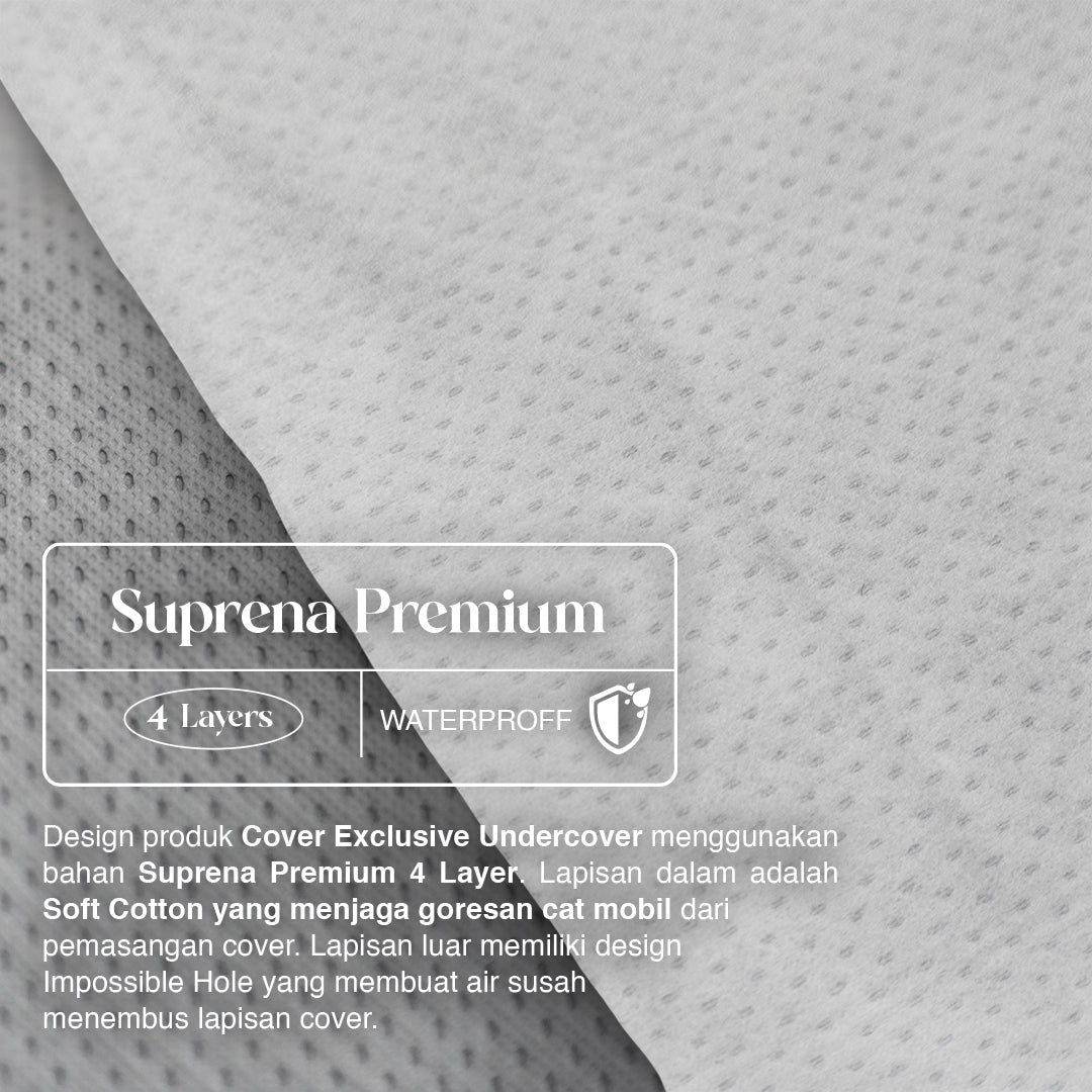 Cover mobil Tipe Exclusive dirancang khusus oleh Undercover Autocare untuk pemakaian diluar ruangan. Tipe Exclusive menggunakan bahan Suprena Premium 4 layers yang memiliki karakteristik berbeda setiap layernya. Penggunaan bahan yang baik dan kuat memungkinkan cover mobil Tipe Exclusive ini menjaga bodi mobil anda dari segala masalah parkir diluar ruangan.